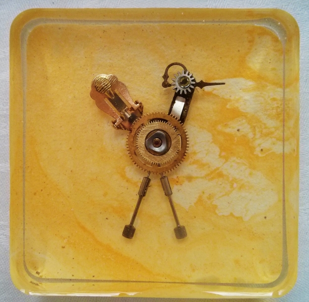 Darian Lajoie. Bawk Bawk; 3x3 inches; marbled paper, found objects, resin. SOLD Not sure what kind of bird this is, but it is definitely one of a kind. With a body made of watch gears, a tail made of the back of an old earring, and legs of calligraphy pen components, it looks like it might “Bawk!” at any moment…