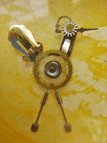 Darian Lajoie. Bawk Bawk; 3x3 inches; marbled paper, found objects, resin. SOLD Not sure what kind of bird this is, but it is definitely one of a kind. With a body made of watch gears, a tail made of the back of an old earring, and legs of calligraphy pen components, it looks like it might “Bawk!” at any moment…