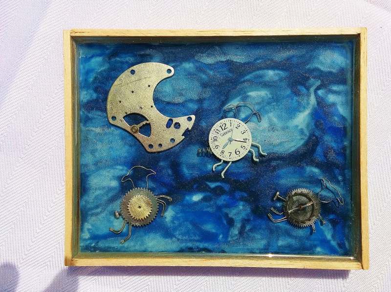 Darian Lajoie. Counting Sheep I; 3x4 inches; 2015; encaustic, watch gears, resin. SOLD A dark blue night sky with a crescent moon is the backdrop for these whimsical sheep made of watch gears and metal wire. If you can’t sleep, count sheep!