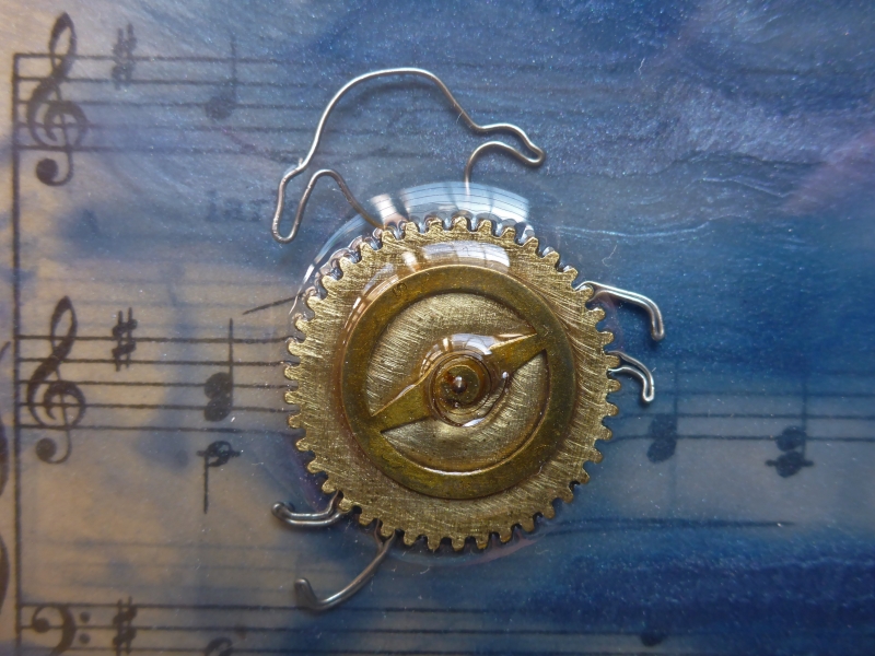 Darian Lajoie. Counting Sheep I; 6x6 inches; 2015; encaustic, found objects, resin. SOLD A dark blue night sky with a crescent moon is the backdrop for these whimsical sheep made of watch gears and metal wire. If you can’t sleep, count sheep!