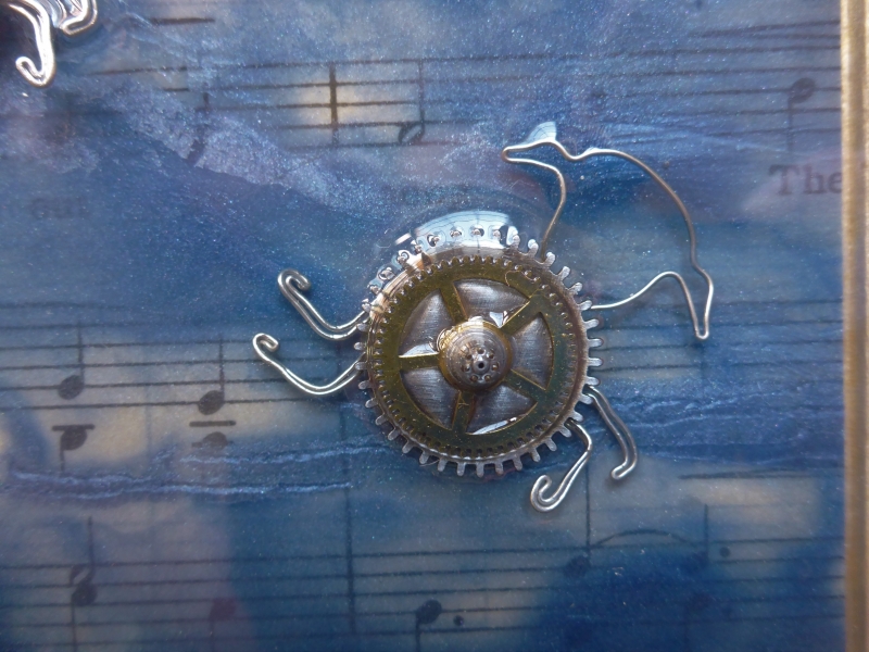 Darian Lajoie. Counting Sheep I; 6x6 inches; 2015; encaustic, found objects, resin. SOLD A dark blue night sky with a crescent moon is the backdrop for these whimsical sheep made of watch gears and metal wire. If you can’t sleep, count sheep!
