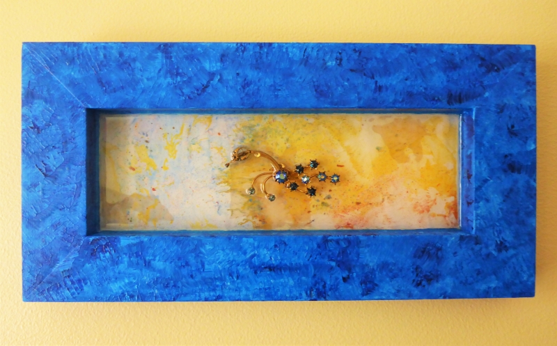 Darian Lajoie. Dragon of Dawn; 6x12 inches; 2015; acrylic, marbled paper, found objects, resin. $75 This piece is made of found objects such as pocket watch gears and broken costume jewelry. The bits seemed to form a dragon before my very eyes as I turned them around and looked at them from different angles. The dragon is encased in a layer of resin on a background of marbled paper whose colours reminded me of a dawn sky. I painted the frame to suggest the bright coming of day.