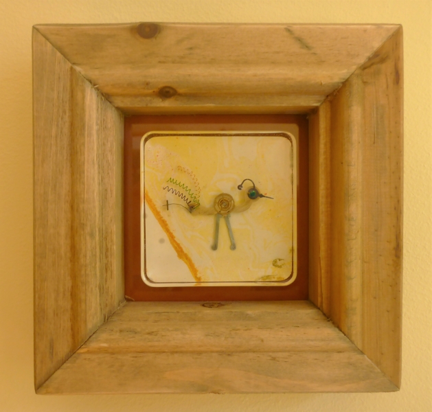 Darian Lajoie. Feathers; 3x3 inches (6.5 x 6.5 framed); marbled paper, found objects, resin. SOLD This whimsical bird has tail feathers of coloured wire and watch gears for a body. A jeweled eye completes his colourful look.