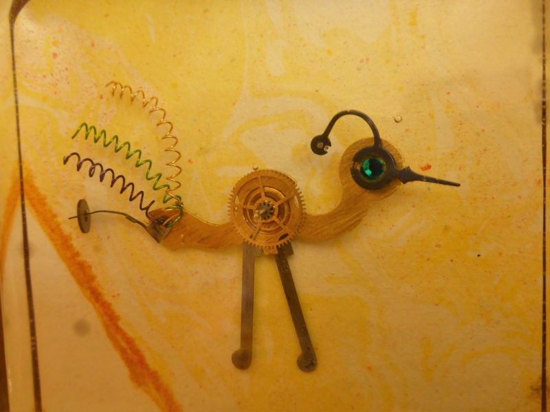 Darian Lajoie. Feathers; 3x3 inches (6.5 x 6.5 framed); marbled paper, found objects, resin. SOLD This whimsical bird has tail feathers of coloured wire and watch gears for a body. A jeweled eye completes his colourful look.