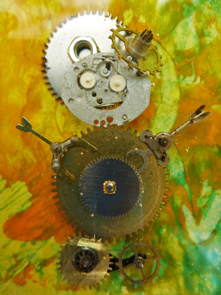 Darian Lajoie. Happy; 3x3 inches; 2015; encaustic, found objects, resin. SOLD This little clockwork fellow, made of watch gears, came out with such a happy little smile that a small encaustic painting with bright colours seemed to make sense.
