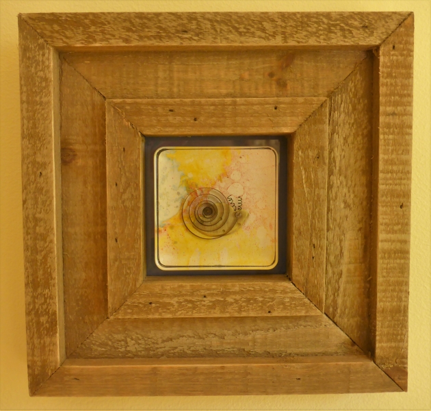 Darian Lajoie. Little Snail; 3x3 inches (9x9 framed); marbled paper, found objects, resin. SOLD Snail made from pocket watch components, wire, found objects.