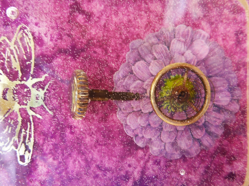 Darian Lajoie. Mech Flower; 1.5x2 inches; 2015; encaustic, found objects, resin. SOLD Encaustic in shades of speckled purple is the background for this flower and bee, enhanced with watch gears. A tiny treasure.