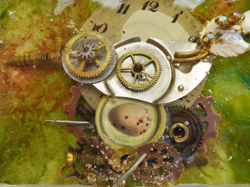 Darian Lajoie. Nesting; 3.5 x 4.5 inches; 2015; encaustic, found objects, resin. $45 This bird sitting on her nest is well camouflaged by the forest colours around her. The bird, nest and egg are made of watch gears, wire, screws and broken costume jewelry.