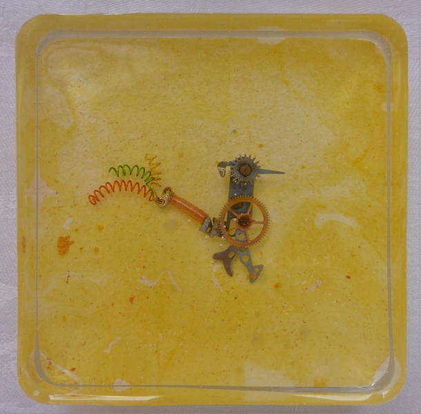 Darian Lajoie. Out for a Stroll; 3x3 inches (9x9 framed); marbled paper, found objects, resin. SOLD This character is out strutting his stuff with tail feathers of coloured wire and watch and electronic components for body and boots. Not sure what he is, exactly, but he looks quite chipper.