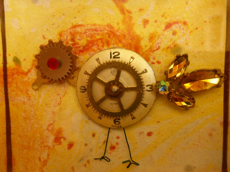 Darian Lajoie. Peck; 3x3 inches (9x9 framed); marbled paper, found objects, resin. SOLD Made of watch gears, wire, and broken costume jewelry, this little chick looks like she’s looking for seeds to peck on her speckled background of marbled paper.