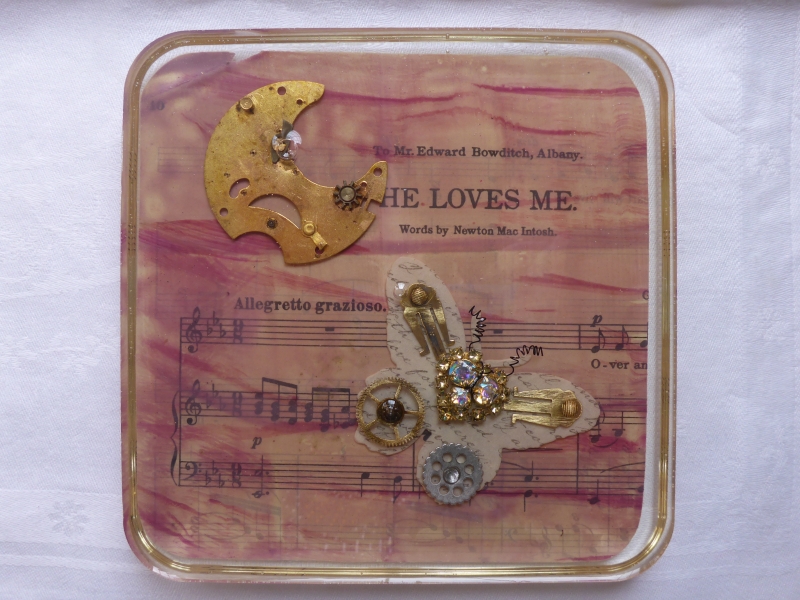 This bejeweled butterfly is made of watch gears and bits of costume jewelry and flutters on a background of delicate pink encaustic painting on antique sheet music.