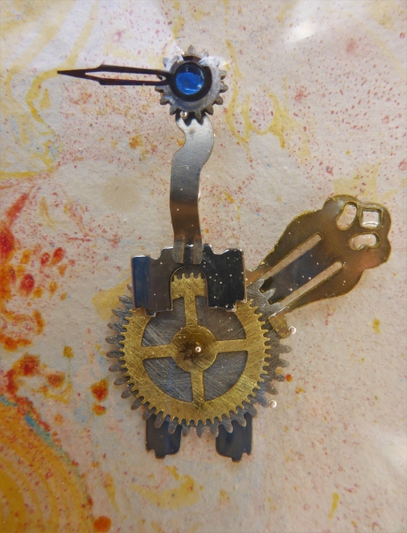 Darian Lajoie. Squonker; 3x3 inches; marbled paper, found objects, resin. $25 With his round belly, large tail and long neck, this guy just looked like a “squonker” to me. Made of broken jewelry and broken watch gears.