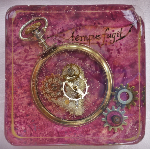 Darian Lajoie. Tempus Fugit; 3x3 inches; 2015; encaustic, found objects, resin. SOLD This clockwork heart looks like it is sinking through waves of time. Tiny bubbles fizzle up through the piece to heighten this effect.