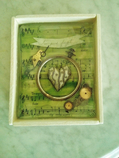 Darian Lajoie. Tempus Fugit; 3x4 inches; 2014; encaustic, paper, found objects, resin. SOLD Encaustic paint over antique sheet music is the background for the tiny found objects embedded in resin that represent the fleeting nature of time and love.