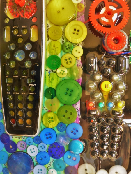 Darian Lajoie. Chemical Imbalance; 10x12 inches; 2015; acrylic, found objects, resin. $85 This piece is meant to illustrate the stark difference between what we ideally want ourselves to be and the reality of what actually is when brain chemistry is unbalanced. The left side at the top represents some of the actual brain chemistry. Below it are pictured some of the outcomes and symptoms of chemical imbalance. The left of the picture is the actuality of what it is to live with depression. The right side of the picture is what we want the world to see and what we ideally hope ourselves to be and the connections and intricacies between those two worlds. I thought it would be interesting to portray that connection with parts of a remote control panel to show the breakdown in communication between the brain chemistry and the sense of self, and what it feels like to know that who one really is, or is meant to be, is masked and distorted when living with depression and anxiety.