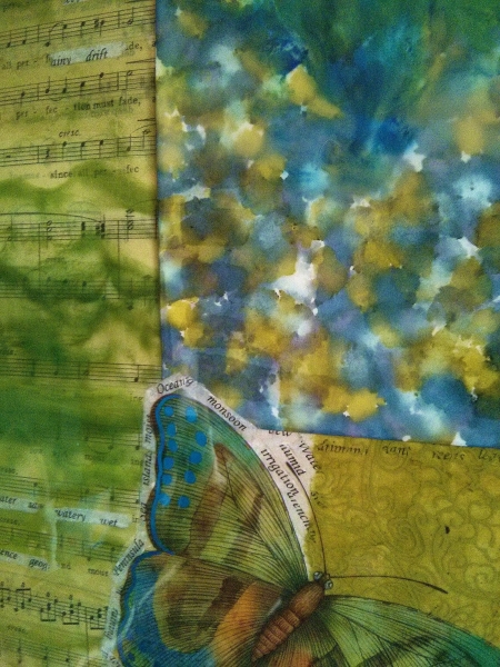 Darian Lajoie. Confluence; 10.25 x 10.25 inches; 2015; encaustic, ink, paper, resin. SOLD I did this piece thinking about the Amazon River and its early exploration. The bleeding in of waters both green and blue where salt water meets fresh water is represented by the blending colours. The encaustic paint over music represents the noise and music of the jungle at the river’s edges and the words around the borders represent the numerous fauna, flora, and geography of jungle and river exploration.