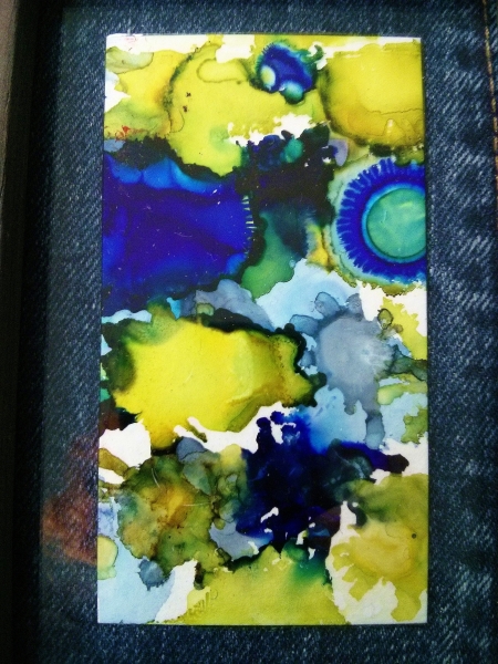 Darian Lajoie. Denim II; 5x7 inches (framed); 2014; ink on film, denim. $45