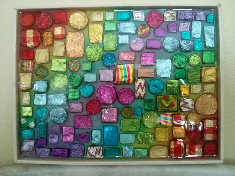 Darian Lajoie. Eggs; 5x7 inches; 2014; watercolour on canvas, foil, resin. SOLD I made this piece out of the foil wrappers from Easter eggs. I hammered them into tightly squeezed shapes and glued them to a painted canvas and encased the entire piece in resin. Although it is hard, the tiny bubbles here and there in the resin, and the magnified look of the little foil shapes makes the hand itch to touch it – go ahead!