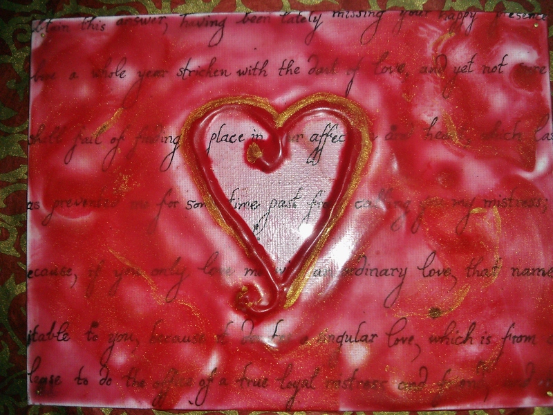 Darian Lajoie. Heart'sPromise; A Love Letter from Henry VIII to Anne Boleyn; 11x13 inches (framed); 2015; ink, encaustic. SOLD This piece is handwritten with a dipped feather pen and is taken directly from a letter written to Anne Boleyn from Henry VIII. The words are partially obscured by passionate shades of encaustic paint in red and gold, the rich colours of the Tudor court.