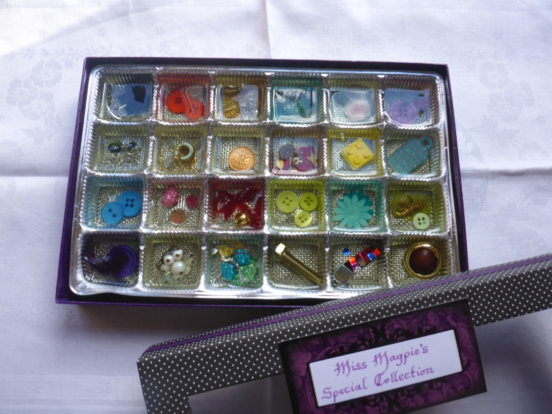 Darian Lajoie. Miss Magpie’s Special Collection; 6.5 x 9.75 inches; 2015; found objects, resin. $40. This box of treats suggests a collection of treasures found by a crow or Magpie. Small, colourful and shiny objects are encased in resin in a repurposed chocolate box, suggestive of something owned by a Beatrix Potter character.