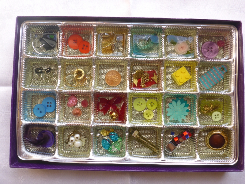 Darian Lajoie. Miss Magpie’s Special Collection; 6.5 x 9.75 inches; 2015; found objects, resin. $40. This box of treats suggests a collection of treasures found by a crow or Magpie. Small, colourful and shiny objects are encased in resin in a repurposed chocolate box, suggestive of something owned by a Beatrix Potter character.