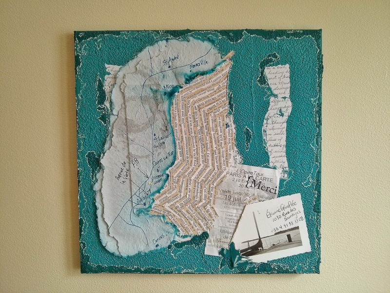 Darian Lajoie. Strangers meeting on a train, speaking different languages; 12x12 inches; 2015; paper, acrylic, glass. (treated with protective sealant) SOLD This is a piece I created after a trip to Europe and I was inspired by the thought of a connection made on a train with a complete stranger. The image seeks to evoke a halting conversation by two people who have made an intense connection despite language barriers by presenting the coastline in shades of light and darker paper with words in both English and French representing the conversation. The coastline is represented in shades of blue and is meant to convey the look of a topographical map of the sea coast and the handmade paper has the look of a tray liner that might have had two glasses of wine staining the map that includes hand written graphics that portray an indication (and perhaps an invitation?) to a meeting place. Will a liaison occur? The possibility is delicious…