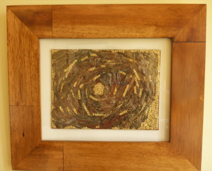 Darian Lajoie. Wood Hive; 6x8 inches (12x14 framed); 2015; wasp nest, paper $95. This is another piece from my series using wasp nest and shredded words from antique books. An outward swirl of nest and the conversation inside seemed the perfect pairing with a frame of natural wood.