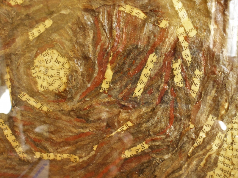 Darian Lajoie. Wood Hive; 6x8 inches (12x14 framed); 2015; wasp nest, paper $95. This is another piece from my series using wasp nest and shredded words from antique books. An outward swirl of nest and the conversation inside seemed the perfect pairing with a frame of natural wood.