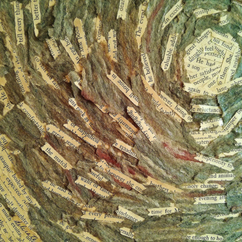Darian Lajoie. Word Hive; 12x12 inches; 2014-2015; paper, wasp nest. (treated with protective sealant) $85 This piece reflects the evolution of a conversation. It is organic, like the wasp paper that the shredded words are interspersed with. It flows outward, growing from a sentence into a whole hive of conversation. It weaves and grows just as a conversation does.